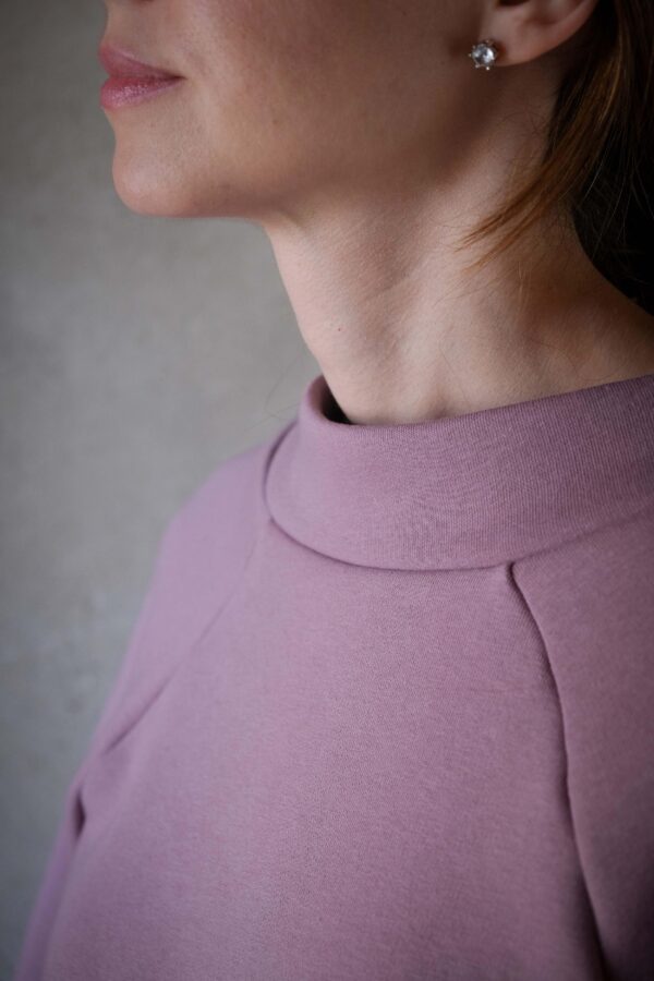 Descubre la sudadera de cuello alto de algodón orgánico en azul y lila de la marca Gemma Oriol, realizada a mano y siguiendo los criterios de sostenibilidad.